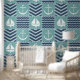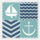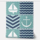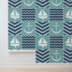 Un motif de carrés turquoise orageux, décoré d'un voilier et d'une ancre blancs, et de carrés bleu marine, accentués de chevrons et de vagues bleu pâle, est accentué par la couture blanche pour créer une atmosphère nautique classique.