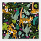 Une jolie illustration dessinée à la main d'un tigre safari dans la jungle tropicale dans une jungle botanique avec des fleurs exotiques, des feuilles, des palmiers et des fleurs sauvages. Ce dessin à thème de tigre tropical a un arrière - plan noir qui crée une scène sombre et humoristique. Un design idéal pour les amateurs d'animaux sauvages, d'illustrations de tigres et de thèmes tropicaux. Customisez ce design de tigre tropical et faites-le vous-même !