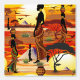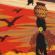 Belle Femme Africaine Silhouette habillée de Cire traditionnelle tissu, portant un pot décoré à la main, Marcher dans la nature Extraordinaire de la Savane Africaine, sur un coucher de soleil chaud et paisible. Illustration vectorielle originale Copyright BluedarkArt TheChameleonArt.