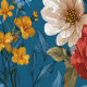 Une motif audacieuse et vibrante avec de grandes fleurs jaunes, crème et rouges sur un arrière - plan bleu vif.