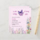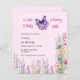 Une invitation à célébrer le 1er anniversaire d'une petite fille. Un arrière - plan rose clair. Décoré d'un papillon violet, rose, violet, fleur sauvage bleu. Personnalisez et ajoutez le nom de la mère à être et les détails de la fête. Texte : Notre petit papillon tourne UN. 1 feuille = 1 invitation imprimé bord à bord.