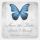 Mariage élégant et simple Enregistrer les stickers Date avec un papillon bleu contre un arrière - plan gris grunge. Ce design est un choix unique pour annoncer un mariage moderne. Facile à customiser avec vos détails mariages. Cliquez sur "Customiser" pour trouver d'autres options de personnalisation.
