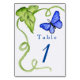 L'art présente une aquarelle d'une vigne verte avec une feuille. Une photo d'un papillon bleu volant est au-dessus du numéro de table. Mots note "Tableau 1" mais peuvent être personnalisés avec vos propres mots et messages. Créez votre propre carte de table unique en son genre en customisant ces cartes de table insectes de jardin modèles pour votre mariage, réception ou autres informations personnelles sur l'événement.