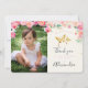 Votre bébé doux a eu une fête d'anniversaire oscillante d'amusement et cette invitation adorable est la carte parfaite pour remercier votre famille et amis de s'associer à la célébration. Insérez votre propre photo pour la rendre extra spéciale. Les fleurs peintes à la main d'aquarelle entourent la photo et le texte, avec les papillons de flottement en or au-dessus du texte. Une invitation assortie d'anniversaire est également disponible. Rose avec les points blancs sur l'inverse.