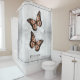 Ajoutez une touche unique à votre salle de bain avec un rideau de douche florale papillon en cuivre. Le design de rideau de douche est composé d'une paire de papillons vibrants reposant sur une vigne florale blanche contre un arrière - plan gris clair. Autres cadeaux disponibles avec ce design aussi.