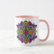 Oeuvre dessinée à la main libellule et fleurs mauve, mandala rose et jaune tasse à café.