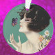 Image vintage d'une jolie dame aux cheveux foncés art déco tenant un joli bouquet de fleurs aux marguerites avec un papillon violet flottant par son nez. Voir mon magasin Art by MAR pour apparier les produits avec ce design.