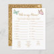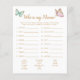 Baby shower à thème papillon mignon "Qui est ma maman ?" carte de jeu avec illustration de papillons rose et vert menthe avec des pointes en faux or. Faites correspondre le nom de l'animal à celui de sa mère ! Celui qui a le plus de noms correct gagne ! CLÉS DE RÉPONSE : 1.GOOSE=GOSLING, 2.DEER=FAWN, 3.SWAN=CYGNET, 4.ZEBRA=FOAL, 5.KOALA=JOEY, 6.SEAL=PUP, 7.PANDA=CUB, 8.WHALE=CALF, 9.PIGEON=SQUAB, 10.ALLIGATOR=HATOR CHLING, 11.GORILLA=INFANT, 12.CAT=KITTEN, 13.TURKEY=POULT, 14.GOAT=KID, 15.FISH=FRY, 16.LLAMA=CRIA