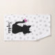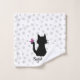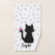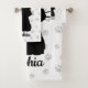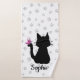 Profitez de ce joli ensemble de serviette de bain avec une silhouette de chaton noir et lunatique avec un papillon rose sur sa queue sur un arrière - plan imprimé en papier pâté gris clair. Personnalisez-le avec le modèle de nom fourni, changez la couleur arrière - plan blanche à votre favori!