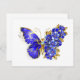 Bijoux, bleu, saphir, papillon aux fleurs pétillantes avec aile décorée de bleu, fleurs précieuses avec feuilles d'or sur arrière - plan blanc.