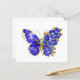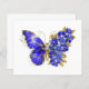 Bijou, bleu, saphir, papillon fleur étincelant avec aile décorée de fleurs bleues précieuses avec feuilles dorées sur fond blanc.