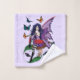 Jolie fée aux cheveux noirs tout en violet et rouge assis sur un champignon dans un fond de violet