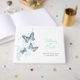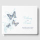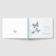 Beaux papillons d'art encastré et livre d'hôtes mariage graphique floral en bleu ciel, corail, et bleu foncé sur blanc. Personnalisez avec vos propres noms et date mariage. D'autres articles correspondants sont disponibles. Art dessiné à l'encre de papillon et design graphique par Sarah Trett pour www.mylittleedenweddings.com