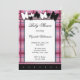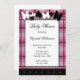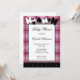 Invitations de douche bébé avec un motif en plaid rose qui souligne l'invitation avec un thème illustré de papillon noir et blanc.
