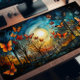 Les papillons monarques sont partout dans les arbres sans feuilles. Les Monarques deviennent les feuilles des arbres, sur un arrière - plan sombre. Grand tapis de bureau, tapis de souris