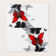 Un troupeau de papillons de morpho volants, réalistes, rouges et noirs sur un arrière - plan blanc avec des gouttes de peinture.