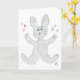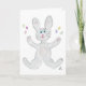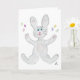 Carte de voeux Portrait 5x7 - Pâques Hoppy! Un gros lapin gris saute dans l'air, des friandises. Il est très heureux de souhaiter au récipiendaire une Pâques Hoppy. Le dessin original est un crayon coloré sur papier, scanné et placé sur la carte.