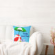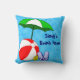 Un coussin personnalisé avec des lettres rétro en bleu et une illustration amusante sur le thème de la plage ou de la piscine avec un ballon de plage rouge, un parasol vert, des sandales de vacances et de l'huile solaire sur un fond de bleus clairs et de vagues ondulées. Cliquez sur Personnaliser pour changer les polices, les couleurs de fond et plus encore.