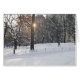 Photo originale représentant le soleil à travers les bâtiments et la neige fraîchement tombée à Central Park.