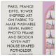 Ce tissu est coupé et cousu, ce qui signifie que vous découpez les panneaux de motif à coudre de l'art formaté, pour faire WASHABLE, TISSU : cadre photo pour photo 4x6" avec dos de chevalet amovible et planche de tapis de jambe de strut ou de carton qui glissent de leurs poches respectives sur le dos, une poche pour la photo et la page de protection en feuilles libres découpée pour la manche de protection, trous de bouton à l'arrière pour le dos, les machines zigzag fonction, longueur de point 0-1, largeur de point 3-5 (zone de fente marquée sur le panneau pour eux) ruban pour connecter la poche de la jambe de strut au chevalet arrière - panneaux de tissu arrière avec Thermoweb Heat n Bond- Ultrahold ou Lite fera (5 jardin roulé pour 8,99 $ chez Michaels, moins 50% de réduction de coupon) qui inclut des instructions sur les panneaux photo, broche lavable, cousue, tissu broche avec broche amovible de 1 3/4" de longueur, trous sur 2 panneaux qui font le panneau arrière avec des trous à perforer poinçonner ou utiliser des ciseaux de broderie pour découper les mécanismes de broderie pour rester en place, les panneaux avant et arrière finis font une poche pour le broche retour à glisser - les panneaux de tissu arrière avec Thermoweb Heat n Bond- Ultrahold ou Lite fera (5) rouleau de cour pour 8,99 $ chez Michaels, moins 50% de rabais) potholder en forme de maison avec potholder carré potholder four mitt graisse 21" x 18" pour les autres métiers que vous décidez de faire avec les instructions sur les panneaux photo cadre, de faire les cadres, ainsi que tous les tissus, les notions, outils, fournitures artisanales nécessaires pour finir l'artisanat, sont tous sur le .. Si vous êtes un francophile, que vous aimez les voyages, que vous aimez le style de vie français, que vous aimez la culture française, que vous aimez la cuisine française - ce tissu est fait pour vous ! Il s'inspire de l'art de Georges Seurat, sa technique de pointillisme, avec un tournage de photos, et de ma balade dans la station balnéaire et casino de Paris Las Vegas, en regardant le design d'intérieur, les façades des boutiques à l'intérieur, Ce tissu a de l'art par, moi, Kristie Hubler, et a vendu sur des couvertures de couette, tapis d'aire, sacs messenger, rideaux de douche, mitaines de four, t-shirts, loungewear, iphone et coques ipad, TISSU sur Spoonflower, ainsi que sur Keds baskets et des glissières ici sur Zazzle (qui ne sont plus disponibles, triste à dire). Vous pouvez même fabriquer des cadres photo lavables en tissu avec des panneaux de dos et de jambe de chevalet amovibles, des broches de bijoux costume avec des dossiers de broche amovibles, des ornements d'arbre, des potholders en forme de maison, et plus, en utilisant des téléchargements de motif couture disponibles à l'achat à http://craftsy.com/user/2496069/pattern-store Il a été un motif très populaire de vente sur des produits, ainsi que des téléchargements gratuits, formatés pour chaque pièce motif pour l'avant, panneau de jambe pour les cadres, ainsi que les broches, et les potholders en forme de maison, les mitaines de four, et les ornements, à imprimer sur Juin Tailor lavable, colorfast, feuilles de tissu d'imprimante jet d'encre, disponible chez JoAnn Fabrics! Merci! Kristie Hubler, artiste http://zazzle.com/fabricatedframes