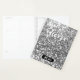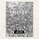 Un nom moderne en gras en blanc avec une ombre portée noire sur un planificateur vierge. La taille, la couleur et le style de la police sont personnalisables. diminuez la taille de la police pour les noms plus longs. La forme noire derrière l'année peut être customisée. L'arrière - plan est un faux confetti argenté ou une parties scintillant de paillettes avec des taches brillantes ou des boules floues.
