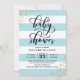 L'élégante invitation au baby shower comprend un arrosage de confettis de parties scintillant en faux or et une police de calligraphie moderne.