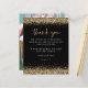 Parties scintillant d'or Script Fête des mariées photo Merci noir. Un prix économique PETIT 4,5 po x 5,6 po alternatif. Disponible dans un STOCK SEMI-GLOSS 110 lb CARD qui est l'option par défaut (plus épais pour les invitations), OU un STOCK SATIN FINISH 80 lb THINNER PAPER (idéal pour les boîtiers). Les enveloppes sont en option et légèrement plus grandes que la taille de la carte. Les frontières de la fausse parties scintillant d'or sont en haut et en bas sur le devant, et le Merci est dans un script de style manuscrit dans la coordination de l'or. Personnalisez facilement le reste du texte. Sur le dos, remplacez l'image de l'échantillon par votre préféré de vous tous à votre événement. Vous pouvez également modifier le texte et les couleurs arrière - plans via l'option customiser plus si vous le souhaitez.