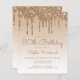 Cette invitation branchée à 80ème anniversaire présente une bordure brillante or faux goutte de parties scintillant et un arrière - plan sombre. Les mots "80th Birthday" et le nom de l'invité d'honneur apparaissent en écriture manuscrite en or décontracté, le reste du texte personnalisable en or sans serif font. La même conception de goutte de parties scintillant d'or apparaît à l'envers.