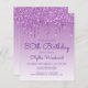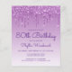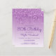 Cette chic invitation à la fête du 80e anniversaire présente une bordure brillante violette fausse parties scintillant et arrière - plan violet sombre. Les mots "80th Birthday" et le nom de l'invité d'honneur apparaissent dans un script décontracté d'écriture violet, le reste du texte personnalisable dans la police sans serif. La même conception de goutte de parties scintillant violette apparaît à l'envers.