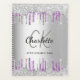 Un arrière - plan métallique à l'aspect faux argenté. Décoré avec des gouttes de parties scintillant violet et faux argent, la peinture goutte à goutte. Personnalisez et ajoutez votre nom, vos initiales monographiques et un titre.