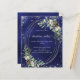 Un arrière - plan bleu marine aux couleurs irrégulières décoré de cônes, de baies blanches et de verdure. Un cadre et une parties scintillant ovales en faux argent. Personnalisez et ajoutez les détails. 1 feuille = 1 invite imprimé bord à bord.