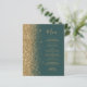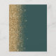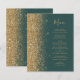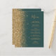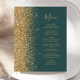 Le bord gauche de cet élégant menu mariage moderne présente une bordure de parties scintillant en faux or. Le texte personnalisable combine un script d'écriture fantaisiste couleur or et des polices de caractères sur un arrière - plan vert foncé. L'envers est assorti d'une parties scintillant vert foncé et dorée.