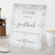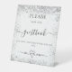 Un arrière - plan blanc chic, décoré de parties scintillant faux argentées brille. Avec le texte : S'il vous plaît signer notre livre d'or. Un panneau sur le plateau demandant aux clients de signer et de déposer leur livre d'or.