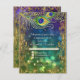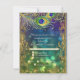 Correspondance de la carte de réponse RSVP avec des choix de menu simples. Cette conception est faite avec des plumes de paon aquarellées à la main ornées de bijoux en diamant dessinés graphiquement (NOTE : il s'agit d'une invitation imprimée à plat il n'y a pas de vrais bijoux, parties scintillant or ou feuille métallique ou encre utilisée) sur un bokeh coloré scintillant, lumières scintillantes arrière - plan en violet profond, bleu, aqua et vert. Modifiez facilement votre texte à l'aide des champs modèles fournis. Art par Audrey Jeanne Roberts, artiste titulaire d'une licence internationale, copyright.