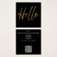Un élégant carte de visite avec le mot "Hello" sur le devant en parties scintillant dorée avec espace sur le dos pour votre nom et vos coordonnées. Cette conception inclut un code QR au dos.