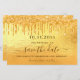 Une petite fille et tendance Enregistrer la carte Date pour une fête d'anniversaire de 50e (ou tout âge). Un arrière - plan moderne à l'allure fausse or décoré avec des gouttes de parties scintillant, la peinture goutte à goutte. Personnalisez et ajoutez une date et un nom. Le texte : Save the Date est écrit avec un grand script de style à la main tendance.