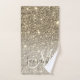 Ajoutez une touche de luxe à votre salle de bain avec ce set de serviettes de parties scintillant en or personnalisé, avec un élégant arrière - plan en faux parties scintillant et une police de caractères élégante. Customisez avec votre monogramme et votre nom pour créer un ensemble unique, à la fois pratique et élégant. Parfaits comme cadeau de ménage, cadeau de mariage ou surprise de vacances, ces serviettes apportent éclat et personnalité à tout décor de salle de bain. Disponible dans un ensemble de 3 pièces (serviette de bain, serviette et linge de toilette) ou individuellement. Fait un cadeau réfléchi pour ceux qui aiment le style et le confort.