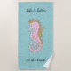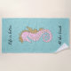 Belle parties scintillant d'aqua émule une eau tropicale scintillante avec un hippocampe rose magique qui s'écoule à travers sa crinière dorée scintillante. Customisez votre propre texte ou laissez-le tel quel. Faites de vos vacances des moments privilégiés grâce à cette serviette de plage à thème océanique unique.