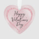 Ce ornement de conservation personnalisé présente un design de coeur rose doux et romantique. L'arrière - plan est un motif en feuille rose bébé avec un cadre cardiaque en parties scintillant rose qui borde le texte. Un message d'accueil "Heureuse Sainte-Valentin" est imprimé au centre dans une police de caractères élégante.
