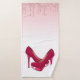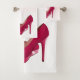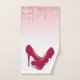 Un design moderne et tendance sur un plan de serviettes. L'arrière - plan a une image de gouttes de parties scintillant rose étincelante, le long du sommet. Le reste de l'arrière - plan est un délicat dégradé de couleur rose pastel. Une paire de stilettos roses à talon élevé ajoute une ambiance design et à la mode.