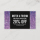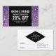 Coordonnée avec le modèle de carte d'affaires Pink Parties scintillant et Glamor Beauty d'ici 1201h. Une image arrière - plan violet riche et profonde fournit un cadre glamour à ce modèle de carte de référence personnalisable. Votre nom ou nom d'entreprise est élégamment stylisé dans une fausse plaque d'identification argentée pour un logo moderne sur le côté arrière. Personnalisez le texte pour votre propre promotion ou offre. Idéal pour les salons, les coiffeurs, les maquilleurs, les concepteurs de clous, les boutiques et plus encore. © 1201AM CREATIVE