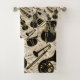 Ce design musical amusant présente une variété d'instruments de musique sur une feuille de musique vintage, arrière - plan de collage. La palette tendance de couleurs noir et or fait un ensemble de serviettes accrocheur. Les instruments présentés sont : guitare acoustique et électrique, saxophone, clarinette, trombone, trompette, corne française, flûte, violon, violoncelle et batterie. Recherchez ID481 pour voir d'autres choix de couleurs et produits avec ce motif.