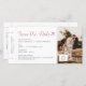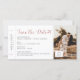 logo d'avion rose or rose sur une carte d'embarquement amusante enregistrer la carte de date pour un thème de voyage ou un mariage de destination, avec la chambre pour une photo et beaucoup de place pour les détails de voyage et d'hébergement. Les détails authentiques du billet d'avion rétro comprennent des petites flèches, un code à barres et une boîte pour une assignation de sièges dans une police d'ordinateur vintage complètent le look. Les mariages de destination exigent d'envoyer aux clients toutes les informations sur l'hébergement avant un mariage local. Si vous voulez simplement sortir le mot pendant que vous élaborez les plans de voyage et d'excursion, le design au verso peut être supprimé, il suffit de cliquer "customiser plus loin". Paper Grape Destinations on Zazzle se spécialise dans les invitations à thème de voyage et la papeterie de mariage-jour pour le couple aventurier, nomade planifiant leurs noces à l'étranger.