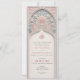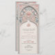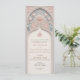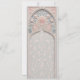 Cette faire-part de mariage séduit par son élégance pastel, avec une palette de couleurs douces qui marie la grâce intemporelle de l'architecture islamique aux sensibilités design contemporaines. L'avant de la carte est ornée d'une arche islamique sereine, fleurie de motifs floraux finement sculptés dans les tons rose vif, blanc crémeux et bleu subtil, évoquant l'art d'un jardin paisible. Une fausse calligraphie de feuille d'or de Bismillah ajoute une touche de signification spirituelle, tandis que le choix de police sophistiqué pour le texte complète l'impression aérée du design. Cette invitation exquise est parfaite pour les couples qui souhaitent mêler tradition et élégance moderne dans leurs célébrations mariages.