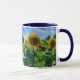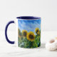 This floral mug features my original photograph of a row of sunflowers with a cloudy blue sky. I processed my photograph with an oil pastel painterly style or an artsy flair. The handle and inside of the cup are blue to complement the artwork.