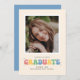 Cette amusante faire-part de graduation d'inspiration rétro comprend le mot diplômé écrit en rose pastel, jaune, vert et bleu. Il a de l'espace pour une photo à l'avant comme à l'arrière. L'arrière comprend également de l'espace pour plus de texte.
