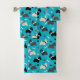 Chiens écossais mignons, noirs, gris et roux, avec des arcs, avec des empreintes et des os de chien sur un arrière - plan bleu.
