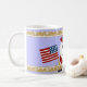 Une belle et festive saison de vacances d'hiver patriotique bonhomme de neige mug. Cette mignonne tasse est l'illustration art numérique d'un bonhomme de neige en rouge, blanc et bleu - étoiles, foulard rayé et casquette Oncle Sam! Il porte aussi un drapeau américain. M. snowman est sur un arrière - plan bleu hivernal avec la neige qui tombe, et a une bordure rayée dorée sur le dessus et le bas de la tasse avec des flocons de neige blancs aussi! Un joli ajout à votre collection de tasses, et un cadeau magnifique et utile pour la famille, les amis, les anciens combattants, ou quelqu'un de spécial actuellement en service dans l'armée, et ou une famille militaire. Remplissez-le avec des bonbons pour en faire un régal encore plus spécial ! Ce design artistique est également disponible sur les cartes et les articles-cadeaux mignons! Pour des cartes de voeux et des cadeaux plus patriotiques, visitez notre boutique !