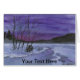Un minuscule paysage aquarelle d'un champ enneigé et crique avec des montagnes contre un ciel brillant et le soir.