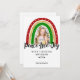 Modèle photo moderne de Noël avec un arc-en-ciel au-dessus de votre propre image. L'arc-en-ciel coloré se compose de trois motifs rayés : rouge avec étoiles dorées, feuille d'or et vert avec flocons de neige. Les mots "paix, amour, joie" sont affichés dans des lettres de script de typographie chic tendance.